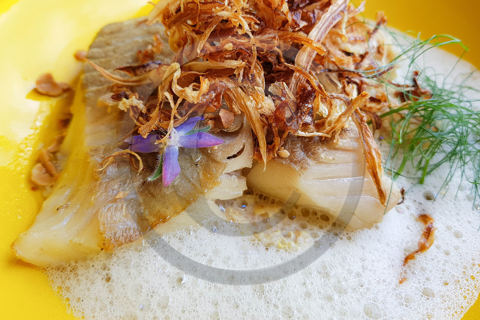 | Description | Haute-Savoie (74), Grand Massif Montagnes du Giffre, vallée du Giffre, Samoëns, Restaurant le 8 M des Monts, Restaurant de produits frais et maison, le chef cuisinier Hugues propose une cuisine créative, originale et savoureuse, réalisée à partir de produits frais et bio, bouillon de Dashi, eglefin purée de choux fleur |