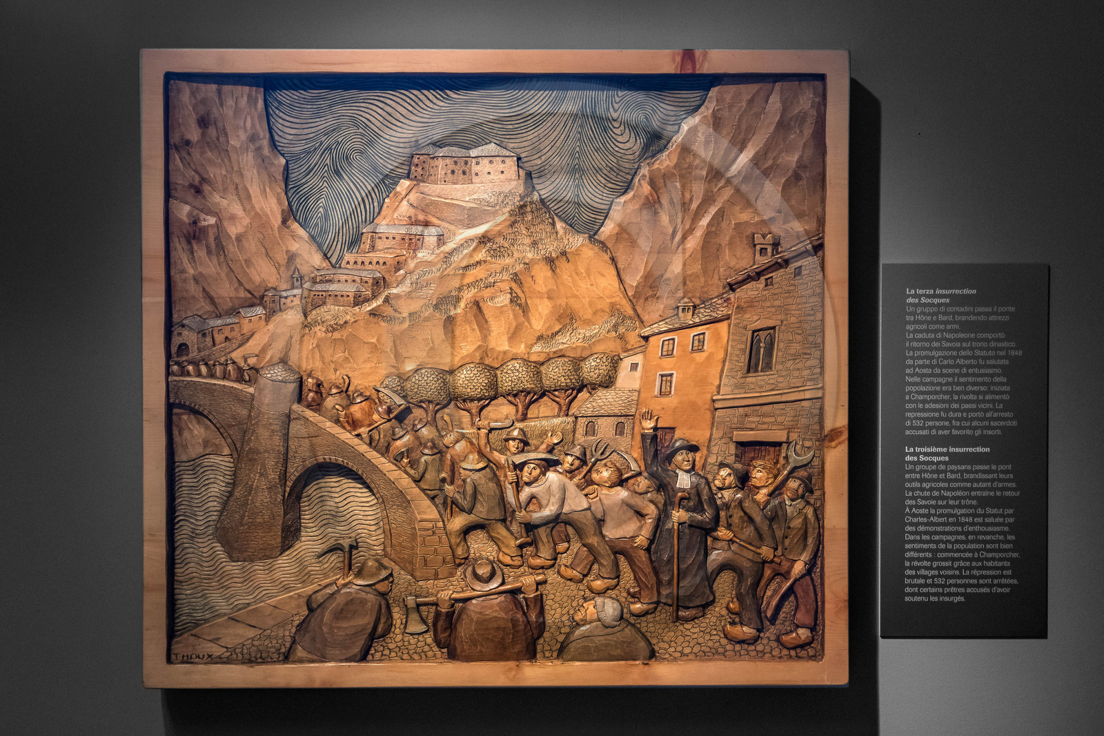 | Description | Italie, vallée d'Aoste, Bard, place forte Fort de Bard, Giovanni Thoux, sculpteur, exposition des scènes de vie liée à la tradition valdôtaine |
